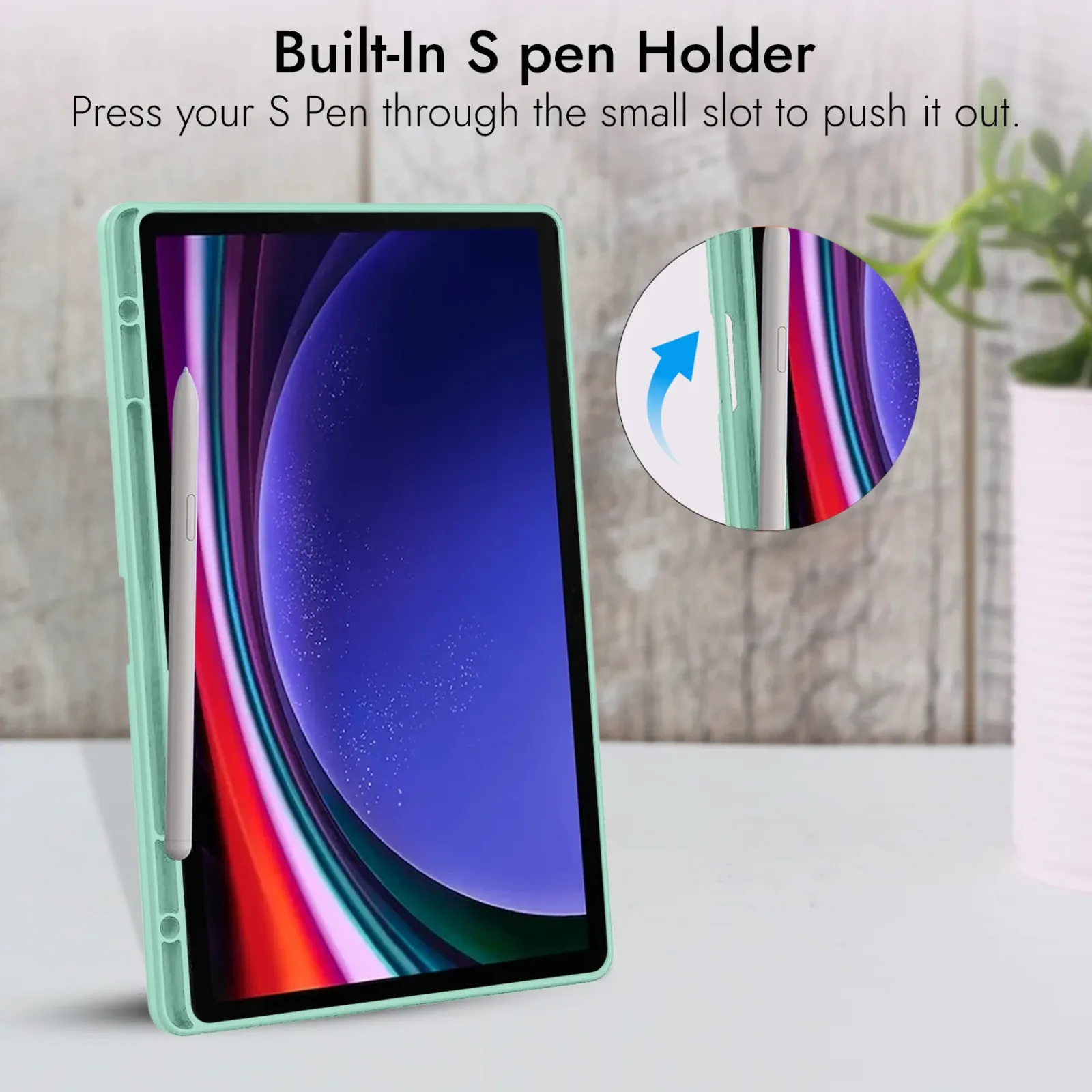 Pencil Holder & Magnetic Attachment : Built-In Pencil Holder to securely carry your S-Pen. The Cover also has a cut at the back to magnetically attach your S-Pen at the back for charging.